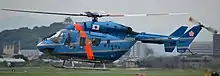 On 25 February 1977, Kawasaki and German aerospace manufacturer Messerschmitt-Bölkow-Blohm (MBB) signed an agreement to cooperate on the development of a new rotorcraft; under the terms of this agreement, the two corporations merged their previously separate projects to produce twin-engined general purpose helicopters, these being the Bo 107 by MBB and the KH-7 from Kawasaki.[6] Separate elements were assigned to each company; MBB were responsible for developing the rotors (these were based on the rigid rotor system previously used on MBB's Bo 105), tailboom, flight controls and hydraulic system while Kawasaki undertook the development of the landing gear, airframe, main transmission, electrical system and other minor components.[7] Each company established their own final assembly lines on which they produced the rotorcraft to meet demands within their respective local markets.[8][7]
