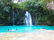 The Kawasan Falls is a three-stage cascade of clear turquoise water from mountain springs located in the jungles of the Cebu island. The falls are part of the Kawasan River in Badian, Cebu, in the Philippines.[2] The water from the falls originates from the Kabukalan Spring and passes through the Kawasan gorge en route to the Matutinao River and the Tanon Strait.[3] The largest waterfall is about 40 meters high, followed by smaller cascades and turquoise water pools that invite swimming.[4] It is a popular tourist destination and is known for its tranquil and relaxing environment, and the adventurous can even enjoy a raft ride or a dive off cliffs.[5]