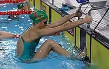 On day two, McKeown won the gold medal in the 100 metre backstroke with a personal best time of 55.49 seconds.[26][27] The morning of day three, she ranked tenth in the preliminaries of the 50 metre backstroke with a time of 26.24 seconds and advanced to the semifinals.[28] In the evening semifinals, she placed ninth with a time of 26.09 seconds.[29] Two days later, she swam the backstroke portion of the 4×50 metre medley relay in the preliminaries in a time of 26.42 seconds, helping qualify the relay to the final ranking first in an Oceanian and Australian record time of 1:44.78.[30] When the finals relay placed first in a time of 1:42.35, she won a gold medal for her efforts in the preliminaries.[31]
