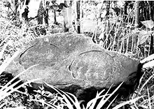Kebon Kopi I also known as Tapak Gajah inscription (elephant footprint inscription),[1] is one of several inscriptions dated from the era of Tarumanagara Kingdom circa 5th century.[2] The inscription bearing the image of elephant footprint, which was copied from the elephant ride of King Purnawarman of Tarumanagara, which is equated with Airavata, the elephant vahana (vehicle) of Indra.[3]: 16