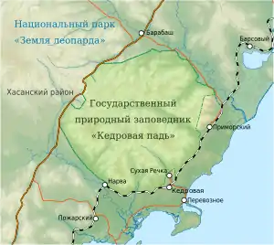 Kedrovaya Pad (Russian: Кедро́вая Падь, lit. Korean Pine Valley)[1] is a nature reserve (gosudarstvenny prirodny biosferny zapovednik) on the territory of Khasansky District in the south of Primorsky Krai, Russia. As of 2011, it occupies an area of 178.97 square kilometers (69.10 sq mi), about one thousandth of the total area of Primorsky Krai.