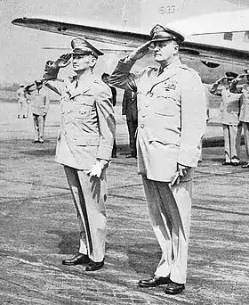 As Chairman of JSC, Hayashi took part in defense collaboration and exchanges with other countries. Since the Defense Agency attached much importance to the research and development of missiles soon after the founding of JSDF, he met Major-General Gerald D. Higgins, the US Chief of Military Assistance Advisory Group in Japan (MAAG-J), in August 1954, to exchange views on the possibility of sending JSDF personnel to the US to study countermeasures against missile attack.[58] In September 1954, he visited the US under invitation of the US Department of Defense. In Washington, D.C., he met Charles Erwin Wilson, US Secretary of Defense, and Admiral Arthur W. Radford, Chairman of the Joint Chiefs of Staff, among other top politicians and military officials.[59] They held high-level strategic conferences, discussing issues on deployment of US troops to Japan and Korea, collective military actions, as well as the possibility of providing sufficient jet planes and destroyers to strengthen the power of the JSDF.[60] When Japan and the US conducted their first joint military exercise at theater level in 1956, Hayashi was the chief official representing Japan, while his US counterpart was Lieutenant-General Arthur Trudeau, Deputy Chief of Staff for Plans and Operations, Far East and UN Command.[61]