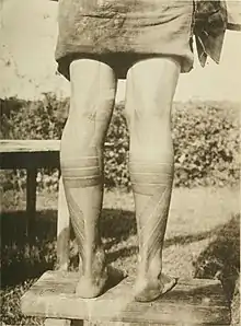 All Kelabit women are tattooed when they reach the age of 16. Bold zigzag bands are traced on the forearm, not completely encircling the limb, and strikingly decorative geometrical designs are tattooed on the thigh, the shin, and sometimes, on the knee-cap. They wear strings of large blue beads around the waist and wrist, and necklaces of smaller beads. 1922.