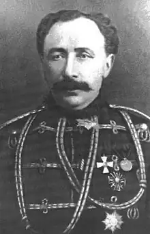 The second lieutenant, head of the Erivan Bek squad. When attacking the enemy's battery, this officer, being in the head of the squad he commanded, in spite of the murderous canister and rifle fire, jumped onto the battery, hacked several artillerymen with his own hand and took one gun in action.[6]