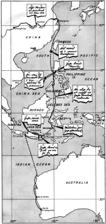 Lanikai was detached on 26 December 1941 and ordered to attempt to escape to friendly waters. This was the start of a two-month odyssey during which Lanikai sailed from Manila in the Philippine Islands, to Surabaya on Java in the then Netherlands East Indies. Lanikai participated briefly in the doomed defense of Java and was strafed by Japanese aircraft on at least one occasion. Just prior to the fall of Java, Tolley took Lanikai to Tjilatjap on the south coast of Java where she evacuated allied stragglers. Lanikai departed Java 26 February 1942 just prior to the Dutch surrender and arrived at Fremantle, Australia on 18 March 1942. After suitable recovery and refitting Lanikai was engaged in patrol work along the northern coast of Western Australia until April 27, 1942.[3]