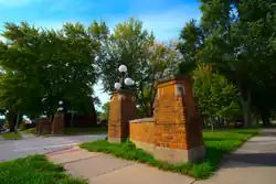 The district features three stylized entrances that were part of the original Kensington Park plan. At East State street, the entrance to Kensington boulevard is flanked by square brick columns with stone tops connected to brick walls that rise to the midpoint of the columns. The columns are corbelled at the midpoint, from whence they are battered upwards. The stone walls are capped with brick corbels to present a contrast to the stone-capped brick columns. A further column is placed on the opposite side of each sidewalk to make a matching pair. Entrance structures matching this set are placed at the south end of the first phase, on the north side of the intersection of Kensington and Lake Avenue, with the addition of globe light fixtures. On the south side of this intersection, a similar structure forms the entrance to the south phase, except it is made entirely of stone the top. Like its counterpart across Lake Avenue, it also features globe lighting.[3]:16–17