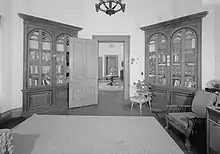 The ground floor features a 26-foot-long (7.9 m) by 13-foot-wide (4.0 m) entrance hall that is joined to form a T-shape with a cross hall at the back measuring 13 feet wide and 27 feet long. The cross hall is centered on the main oak staircase. Both halls employ large ornamental oak arches to visually define the spaces. The parlor is entered from the right side of the entrance hall and has an ornate plasterwork cornice with a central ceiling medallion. It measures roughly 18 by 26 feet. The sitting room is across the hall on the left and measures 18 by 18 feet. The octagonal library is entered from the east end of the cross hall. The library is furnished by a pair of built-in arched bookcases, features an elaborately molded plasterwork cornice, and measures roughly 18 by 22 feet. The dining room is on the opposite end of the cross hall and is the same size as the parlor. Other rooms on this floor include the smoking room, sewing room, a large butler's pantry and adjacent storage room.[3]