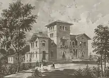 The plans for Kenworthy Hall evolved over the course of the next several months, with the plans continuing to be worked on through correspondence even as the brownstone trim, shipped from New York, began to arrive at the site. Carlisle had difficulty in finding labor skilled enough for such an ambitious house, but he finally found a master mason, Philip Bond, in November 1858 and work then commenced. Bond estimated that the brickwork would be completed by June 1859. The family had moved into the house by 1860.[3]