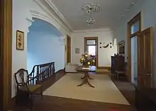 In addition to the main staircase, there is a servant's hall with its own staircase and an elliptical family staircase just off of the family entrance. The second floor features a central cross hall that corresponds exactly to the one below. Around it are clustered an upstairs sitting room, five bedrooms, and a linen room. The upstairs sitting room has a small adjoining chamber and direct access to the servant's staircase. Two of the front bedrooms have large adjoining dressing rooms that are original to the plan. A large trunk room between the upstairs family hall and the two front bedrooms has been converted into a bathroom. The family staircase on this floor continues up to a landing that opens into a former servants room measuring roughly 19 by 19 feet on the third floor of the tower. This landing also has an entrance door into the attic. The fourth floor tower is accessed by a straight flight of stairs located just outside the servants room and the third floor landing. This room measures the same as the servant's room below and has three arched casement windows on each wall for a total of twelve.[3]