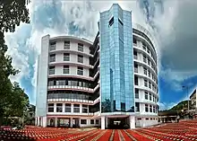 The foundation stone for the new multi-storied building now housing the High Court of Kerala was laid on 14 March 1994 by the then Chief Justice of India, Justice M. N. Venkatachaliah. The estimated cost of construction was 100 million Indian rupees.[2] The construction was completed in 2005 at a cost of 850 million Indian rupees. The completed High Court building was inaugurated by the Chief Justice of India, Justice Y. K. Sabharwal on 11 February 2006. The new High Court building is equipped with modern amenities like videoconferencing, air conditioned courtrooms, internet, and facilities for retrieval of order copies and publishing of the case status via the internet. The building is built on 5 acres (20,000 m2) of land and has a built-up area of 550,000 square feet (51,000 m2) over nine floors. The building has in it a post office, bank, medical clinic, library, canteens and such other most needed utilities and services. The High Court of Kerala has moved to its new building from the date of its inauguration, from the adjacent palace, where it had been functioning.