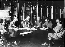 On 15 September Kerensky proclaimed Russia a republic, which was contrary to the non-socialists' understanding that the Provisional Government should hold power only until a Constituent Assembly should meet to decide Russia's form of government, but which was in line with the long-proclaimed aim of the Socialist Revolutionary Party.[34] He formed a five-member Directory, which consisted of himself, Minister of Foreign Affairs Mikhail Tereshchenko, Minister of War General Aleksandr Verkhovsky, Minister of the Navy Admiral Dmitry Verderevsky and Minister of Posts and Telegraphs Aleksei Nikitin. He retained his post in the final coalition government in October 1917 until the Bolsheviks overthrew it on 7 November [O.S. 26 October] 1917.