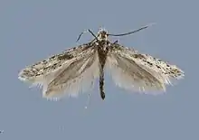The length of the forewings is 5.8–6.9 mm for males. The forewings of the males are white, mottled with black. The black dots on the veins and in the terminal area. There is a black patch near the base and an oblique blackish fascia at about one-third to halfway. The hindwings are dark grey. Adults have been recorded on wing in late July.