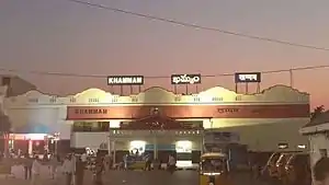 Khammam (formally Khammam Mettu or Combamettu[5]) is the city in Khammam district of the Indian state of Telangana. It is the fourth largest city in the state. It is the headquarters of the Khammam district and Khammam mandal also.[6] It is located about 193 kilometres (120 mi) east of the state capital, Hyderabad, 61 kilometres (38 mi) from Suryapet, 120 kilometres (75 mi) from Warangal and also it is located about 121 kilometres (75 mi) North of the Andhra Pradesh state capital, Amaravathi. The river Munneru flows on the western side of the city.[7] As of 2011 census of India, Khammam urban agglomeration has a population of 313,504.[3] However, on 19 October 2012, the civic body of Khammam was upgraded to a municipal corporation. Post- upgradation to corporation, the population of Khammam was approximated to be 3,07,000.[8]