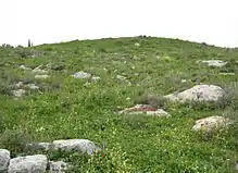 Discoveries include burial caves with remains from the Bronze, Iron, Hellenistic, Roman, Byzantine, and Arabic eras.[1] The eastern hill is still unexcavated, with visible remains of a 150-meter (490-foot) stone wall built with a double row of large stones, rock cuttings and two wine presses.