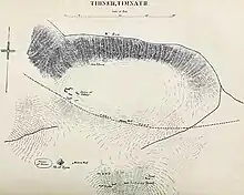 Both in 1863 and in 1870 Guérin visited, and described several ruins.[7] Khirbet Tibnah is described in 1882 as a tell overlooking a deep valley (Wady Reiya) on the north and the ancient Roman road to the south. A cemetery was situated on a flat hill nearby, and to the northwest, the spring of Ein Tibnah emerged from a rocky channel. On the southwest was an oak tree some 30 or 40 feet high, and two wells, one of them dry. West of the tree were traces of ruins believed to be those of an Arab village.[8]