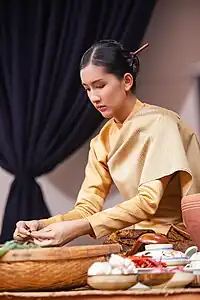Bai domram is a rice dish served with multiple side dishes meant to be eaten with it. It is prepared by allowing the cooked rice to cool overnight and absorb the morning dew. This process infuses the rice with a subtle essence. To enhance the aroma, jasmine flowers are added to the dish in the morning.[17] During the dry season, bai domram is appreciated for its cooling effect.[2]