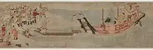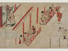 The Kibi Daijin Nittō Emaki originally consisted of a single scroll 32 cm (13 in) high by 2,440.8 cm (960.9 in) long, the longest single scroll ever known, before being separated into four parts.[2][3] It dates from the second half of the 12th century (end of the Heian period (794–1185) or early Kamakura period (1185–1333)), when a renewed interest in the narrative subjects and life of the people was reflected in the topics of contemporary emakimono.[4][5]