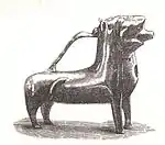 In 1868 a crannog, its causeway and up to four logboats were revealed at the south-west corner of the loch as a result of dumping of furnace-slag from the now closed ironworks,[6] causing the lake-bed sediments to be pushed upwards so that the crannog and logboat remains were exposed above the surface of the water. A site known as 'The Cairn' was already recognised, being exposed during exceptionally low water conditions.[20] The crannog and causeway are marked on the 1st edition of the OS 6-inch map (Ayrshire, sheet viii) at NS 3238 5356. Two of the boats were recorded in some detail. The most complete of the longboats was 18 ft (5.5 m) in length, 3 ft (0.91 m) in breadth and circa 2 ft (0.61 m) in 'depth'; about 2 ft (0.61 m) had been lost from the bow. The stern was 'square'. A tripod pit and a bronze ewer were found in one of the boats, now preserved at the Royal Museum of Scotland. These items were not contemporary with the logboat.[21] The boat itself disintegrated rapidly on exposure to air. Part of a second logboat was subsequently found 'close by the island'; its fate is not recorded. This boat was worked from 'oak'.[22]