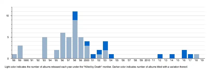 By the end of 1989 Kugelberg's Redrum Records' had released the first four volumes of Killed By Death, after which a fifth and sixth Killed By Death emerged in 1993, issued by an Australian record collector.[4] Over 30 subsequent volumes of Killed By Death were released during the 1990s, all assembled by various anonymous compilers and released independently of one another. This resulted in the records' diversion from any strict numbering system as no one could predict where and when a particular volume of Killed By Death would hit the streets.