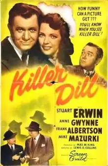 Killer Dill is a 1947 American comedy film directed by Lewis D. Collins and starring Stuart Erwin, Anne Gwynne and Frank Albertson. It set in 1931 during the Prohibition Era.[2][3]