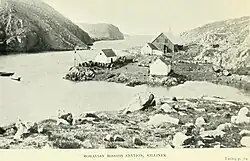In 1904, the Moravian missionaries, the Brethren's Society for the Furtherance of the Gospel among the Heathen, bought the Job Brothers station. At the northwest corner of the Fort Burwell harbour,[15] they established their own mission and trading post, including a bakery, smithy, and carpentry shop.[16] Church services included a harmonium.[17] The next year, the Moravians announced in their periodical account that the local name "Kikkertaujak" would be changed to "Killinek".[18] Some of the missionaries included P. Hettasch, Walter W. Perrett, and S. Waldmann. During the period of August–October 1906, Dresden ornithologist Bernhard Hantzsch stayed at the Killiniq mission studying the Inuit culture, and creating bird and mammal inventories of the surrounding lakes and mountains.[19] The Moravians closed their mission in 1924.[20]