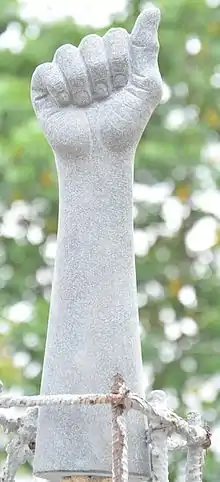 The Communist Party of India (Marxist) organises an annual "Venmani Martyrs Day" to commemorate the massacre. Foundation stone for memorial was laid by Jyoti Basu in 1969 when he was Deputy Chief Minister of West Bengal. The memorial was erected by the party in the form of a black granite monolith carved with the names of the forty-four victims, including fourteen victims from one family. It is topped with the hammer and sickle of the CPI(M). A plantain bud "carved out of monolithic red granite mounted on a platform serves as a memory of the dead".[4] Other political groups have also participated in the commemorations.[8] The Dalit political party Viduthalai Chiruthaigal Katchi have objected to Communist control of the event. Its district secretary S. Vivekanandam said, "We also want to pay tributes to the martyrs. But the CPM does not allow us to arrange for any programmes during the anniversary saying that only their party stood in support of the farmers of Keezhvenmani. They also said that they had got the place of massacre registered in their party's name. It is unacceptable that a single party claims ownership of the historical place".[8]