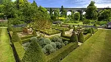 The current layout is a reproduction of a 1960s Chelsea Flower Show medal winning garden designed by George Whitelegg and includes a rockery and parterre.[12] The area adjacent to the river includes hostas, day lilies and candelabra primulas.[13]