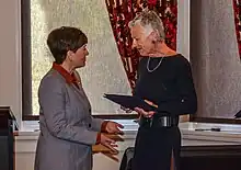 Hill (right) is presented with a Paul Harris Award by the governor-general, Dame Patsy Reddy, at Government House, Wellington, on 13 September 2019
