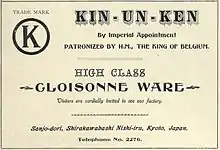 Advertisement of Kin'unken cloisonné company in Kyoto, circa 1910.