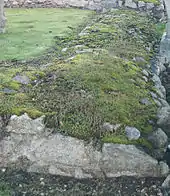 The remains of the former parish church dedicated to St Erchard and the Virgin Mary, which appears from documentary evidence to have been a minster in origin.[20] St Erchard is said to have been a local disciple of St Ternan [21] and to be buried in the church. The ruin, of small stones and run lime was repaired and stripped of ivy etc in 1931 to reveal possible 14th century detail including a fine walled-up north door and lancet windows. The granite belfry probably dates from about 1640. The date of foundation of the church is not known but it passed into the possession of the hospital in its foundation before 1231. Foundations which extend 22 meters east of the east gable and architectural peculiarities of the gable itself suggest that the hospital may have adjoined the church on the east. Two windows in the upper part of the gable look into the church as if from an upper floor of the adjoining building as occurred in some monastic buildings in order that sick persons might hear the service. In this case the lancet windows in the east gable would be later insertions, probably dating from the period when the adjoining building was removed. They may in fact have belonged to that building. The church was in use until 1861 when a new church was built. The roof was removed in 1862 and in 1869 the interior was divided into private burial grounds for the ministers and certain of the heritors. Granted with all its pertinents to the hospital of Kincardine O'Neil by its founder, Alan Durward, before 1231, this grant was confirmed in 1250. Along with this church apparently passed its four pendicles of Glentanar, Lumphanan, Cluny and Midmar. The last two of these may, however, have been granted to the hospital independently and were served by vicars in 1274, the hospital master then being taxed 'pro omnibus eclesiis'. In 1330 the hospital with its annexed chapels was erected with the consent of Duncan, earl of Fife, into a prebend of Aberdeen cathedral by Bishop Alexander de Kyninmund. The residual fruits of this prebend with its four annexed chapels were appropriated in 1501 to the Chapel Royal at Stirling, provision being made for vicar pensioners, but it is doubtful whether this was effective. The prebend itself remained with a canon of Aberdeen cathedral, who possessed the parsonage and vicarage teinds of all four pendicles, but only the parsonage teinds of the mother church, the cure being served by a perpetual vicar. The church measures 20.6m by 8.3m with walls 1.0m to 1.3m thick. The foundations on the east side are clearly visible, just protruding through the turf and denote a building of similar dimensions to the church. The North-East corner of the foundations are destroyed.