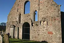 The most comprehensive archaeological survey of the Church and the remains of the hospital are found in Douglas Simpson's book.[10] In this he identifies the lancet windows in the east gable as strong evidence for the existence of the abutted building - the hospital. His argument is that the residents of the hospital - both travellers and the sick or needy would be able to hear Mass from the Church through the windows. The windows, when viewed from the outside of the church ruins (the east end) are clearly internal windows. See the photograph alongside. Douglas Simpson writes as follows:[10]