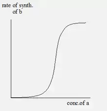 If a product an acts to stimulate the production of b, it is a positive regulator. In this case, the rate of synthesis of b increases with increasing concentration of a, and makes a curve similar to that shown in figure B.