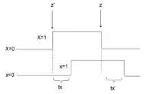 The temporal relation between a logical variable x which is associated with the level of an element and a logical function X which is associated with its evolution can be explained as follows.