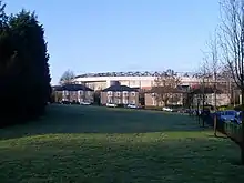The local eponymous Church of Scotland parish Church (1930)[16] and St Oswald's Episcopal church (1931)[17] are both found in the east of the district on Castlemilk Road (there is also a Kings Park Baptist Church on Castlemilk Road, but this is the continuation of the same road in Croftfoot, half a mile to the south).[18] Opposite the churches is a row of convenience stores, cafes and a post office, formerly a small public library (on the Rutherglen side of the local authority boundary so operated by South Lanarkshire Council) which closed in 2010,[19] and the site of the State Cinema, later a bingo venue, which was a prominent landmark in the area from the 1930s until its demolition in the early 21st century.[20][2][21] Another imposing structure in the area which has survived is the Cathcart Old Parish Church dating from the late 1920s[22][23] (not to be confused with the ruin of its predecessor a short distance to the west at Manse Brae, including a graveyard dating back centuries)[23][24] which stands out in its surroundings, a flat area mostly consisting of bungalows.[25]