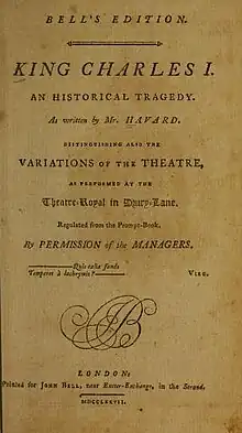 King Charles I is a 1737 tragedy by the British writer William Havard. Written as an imitation of the style of Shakespeare's history plays, it focuses on the imprisonment of Charles I following his defeat in the Civil War and execution by the English Republic.[2] It was a major success and anticipated later works by portraying Charles as a devoted family man who is undone by the scheming of Oliver Cromwell and his allies.[3]