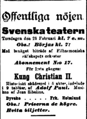 - ↑ "Incidental music / King Christian II (incidental music and orchestral suite)". Jean Sibelius. Finnish Club of Helsinki. Retrieved 24 September 2014.