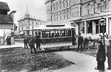 Seattle Street Railway's first streetcar at Occidental Avenue and Yesler Way with Mayor John Leary and city officials in the fall of 1884
