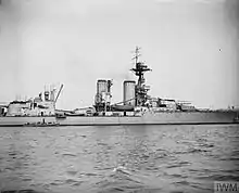 Training exercises had shown that destroyer and torpedo boats attacked more frequently from the frontal arc, so the sixteen 50-calibre BL four-inch (100 mm) Mark VII guns of the secondary armament was re-arranged to improve fire distribution ahead. Eight of these were mounted in the forward superstructure, four in the aft superstructure, and four in casemates in the side of the hull abreast of the forward main gun turrets, all in single mounts. The guns in the hull casemates were frequently unusable in heavy seas and were later removed during the war. The Mark VII guns had a maximum elevation of +15° which gave them a range of 11,400 yards (10,424 m). They fired 31-pound (14.1 kg) projectiles at a muzzle velocity of 2,821 ft/s (860 m/s).[7] They were provided with 150 rounds per gun. Four 3-pounder (1.9 in [47 mm]) saluting guns were also carried. The ships were equipped with three 21-inch submerged torpedo tubes, one on each broadside and another in the stern, for which 14 torpedoes were provided.[2]