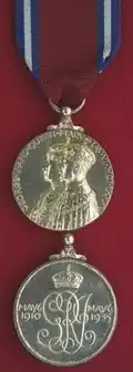 • A circular, silver medal, 1.25 inches in diameter. The obverse features the conjoined effigies of King George V and Queen Mary, crowned and robed, facing left. The legend around the top edge reads "GEORGE • V • AND • QUEEN • MARY • MAY • VI • MCMXXXV".[2]