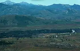 King River near Mount Huxley in the 1970s prior to damming. Frenchmans Cap is located in upper left corner of the photo.