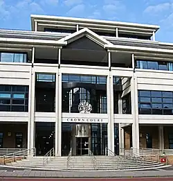 Work on the new building started in February 1994.[7] It was designed and built by a joint venture of HBG and Kyle Stewart[8] in the modernist style[9] in brick and glass with stone dressings at a cost of £18 million and was completed in 1997.[10] The design involved a symmetrical main frontage of eleven bays facing onto Penrhyn Road with the central five bays projected forward. The central bay featured a recessed full-height glass atrium with a semi-circular revolving door on the ground floor, a modern oriel window and a Royal coat of arms on the first floor and a small pediment above. Internally, the principal rooms were the courtrooms which were equipped with curtains to hide the witnesses where necessary.[11]