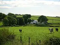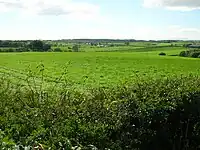 In 1779 a mansion still stood at Kirkwood near the middle of a small enclosure, with an apparently raised area in front, delineated by trees.[14] The mansion house stood until the 1790s.[16] The first 6-inch OS map shows a well laid out garden complex in front of Kirkwood, corresponding to the raised area shown on the 1779 map, with paths that led, following field boundaries, to the old toll road near North Kilbride Farm.[17] In 1799 a 'smiddy park' is shown with three buildings to the west of the house. Gunshill nearby is shown as a single building with a small enclosure in front of it.[14] The field or 'Park' names of Kirkwood and Gunshill are of interest, including Whin, Johnshill, Stone, Byrestead, Gooseward, Ward, Wood, Long Crooks, Hillock Holm and the Chapel-lands across the road.[14]