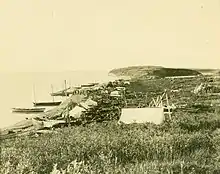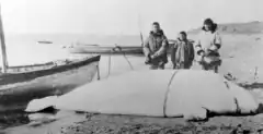 Kitigaaryuit bears evidence of human settlement dating back to at least 1400 AD.[2][4] During the summer, it was an important site for beluga whale hunting, and the largest known gatherings of Inuvialut (up to 1000 people) are said to have occurred there.[5]: 26 The very shallow waters in the area made it a sort of trap for belugas, which were hunted by groups of men in kayaks using harpoons.[6]: 19–20 Kitigaaryuit's population varied by season; many Kitigaaryungmiut left the area around the start of autumn because better hunting prospects could be found elsewhere. In December, people would return for seasonal celebrations, but soon depart, only to return for the next beluga hunt. Inhabitants lived in caribou skin tents in the summer season and in multi-family wooden houses during the winter.[6]: 22–4 Large buildings called qadjgit or kajigi were used as gathering places for men and for ceremonial purposes.[2][3]