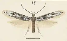 The wingspan of the male is 9–10 mm. The forewings are dark grey with an oblique bar of white suffusion from the costa at one-sixth, reaching half across the wing, accompanied with some whitish-ochreous scales, sometimes tending to extend along the costa to the base. There is an undefined patch of blackish suffusion in the disc beyond this, representing the first discal and plical stigmata, and a rather large roundish black spot representing the second discal, with more or less whitish irroration between these and on the margins of the second discal. There is also a white patch occupying the apical fourth, mixed with dark grey or dark fuscous towards the apex, the anterior edge irregularly indented in the middle. The hindwings are grey-whitish, with the apex greyer.[2]