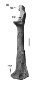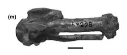 The scapula had a wider caudal portion with a more curved dorsal border than that of Tonsala, and the truncate caudal margin faced medially instead of laterally like in Hokkaidornis. The coracoid had a processus lateralis forming an omally directed hook, and the angle between it and the sternal articular facet was steeper than that of Copepteryx; the extremitas sternalis was devoid of the narrow spur present on the latter genus. The vertebrae were devoid of the co-ossified ligaments present in modern sulids and cormorants. The stoutness of the femur of K. abyssa was intermediate between that of Tonsala hildegardae and those of the larger Japanese genera. The tibiotarsus had a wider intercondylar fossa, a lower medial condyle, a narrower pons supratendineus than that of Olympidytes.[2]