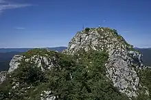 Klek is positioned as a prominent ridge on the eastern tips of Velika Kapela, and its slopes descend toward Ogulin and the valley of Dobra. The peaks are steep and rocky, and there are two most important ones, Klečice or Mali Klek (1058 m), and Veliki Klek (or just Klek, 1182 m), with its prominent vertical 200 meters high "southern rock".