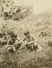 Two native Borneans designated as "Klemantans" by Charles Hose. Original caption in his 1912 book: Klemantans making fire in the jungle by sawing one piece of bamboo across another.