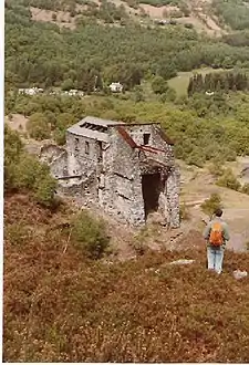 The main north and south walls of the mill building are buttressed, and it is not known whether these buttresses were part of the original design, or whether they were added after the collapse mentioned above. Certainly they were needed, given the design of the building which only had solid walls on 3 sides - the western wall was timbered, and clad in corrugated iron. Apart from the cavernous main mill building, which housed the main equipment, i.e. stone-breaker, Cornish rolls, trommels and jigs machinery, the northern extension held Wilfley tables, and the most southerly part was the turbine room. The office was a separate building to the north, half-way to the road bridge.