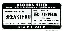 The bands themselves loved the location and the ambience of Klook's Kleek. Jimmy Page said, “We loved doing gigs in places like Klook’s Kleek but in the end, they were turning away more people than could actually see the show”.[6] At Georgie Fame's 55th birthday bash at The Forum, he brought on Zoot Money to do “Papa’s got a brand new bag” with the words, “He had the best RnB band in the 60s”, which Zoot denies—“No he did”. As the number finishes with both at the top of their form Zoot shouts, “Klook’s Kleek 1964” [7]. John Mayall and Dick Heckstall-Smith both recall dropping in to the club to see Cream and Graham Bond respectively. Dave Thompson in his history of Cream mentions that the audience at KK “was already spilling through the downstairs bar and into the street. If people couldn’t actually see the band they could listen through the wall.” [8]