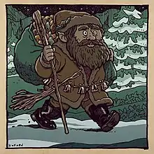 The companions of Saint Nicholas are a group of closely related figures who accompany Saint Nicholas in territories formerly in the Holy Roman Empire or the countries that it influenced culturally.[3]: 146 These characters act as a foil to the benevolent Christmas gift-bringer, threatening to thrash or abduct disobedient children. Jacob Grimm (in Deutsche Mythologie) associated this character with the pre-Christian house spirit (kobold, elf) which could be either benevolent or malicious, but whose mischievous side was emphasized after Christianization.[4]